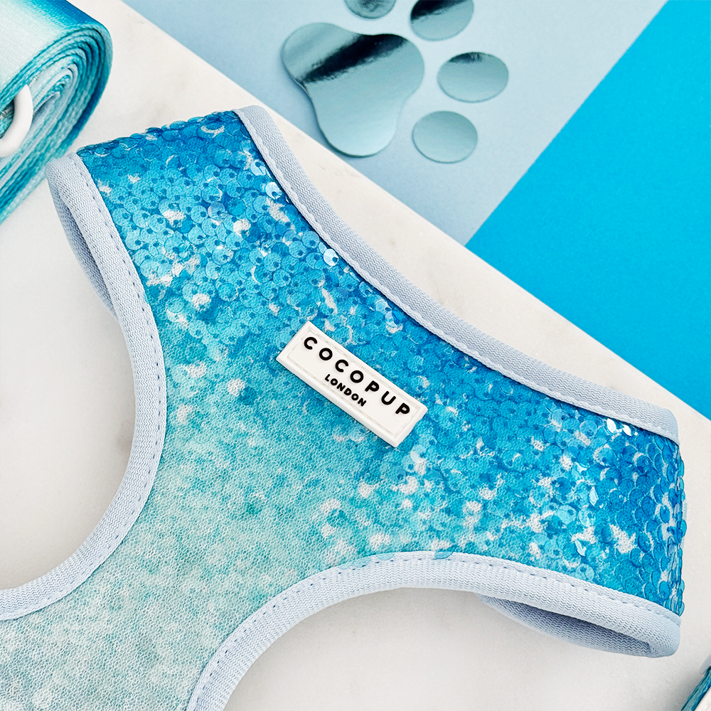 Get ready for a bark-tastic time with our Seaside Shimmer Adjustable Neck Harness! With a glistening blue sequin design, this harness is perfect for walks on the beach with your furry friend. Plus, the safety lock on the buckle ensures a worry-free summer adventure. Woof!