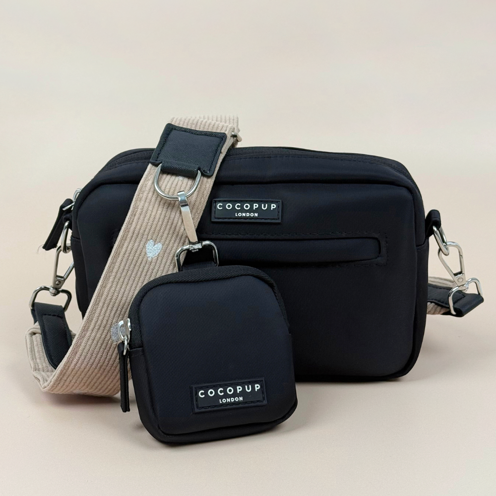 Take your dog for a walk in style with this Bundle featuring the Dog Walking Black Bag and Chai Hearts Bag Strap.