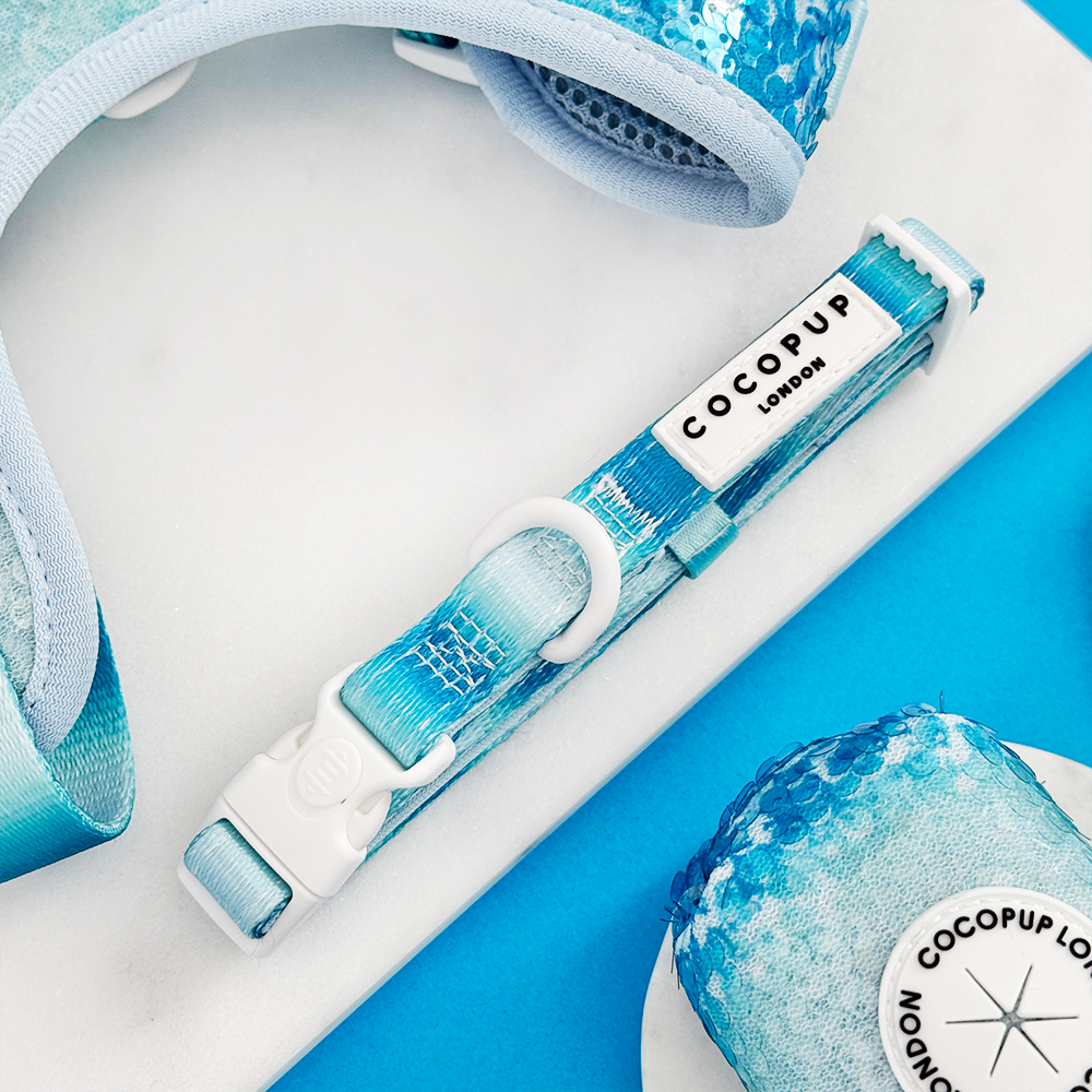Get ready to shimmer, sparkle, and shine! Our Seaside Shimmer bundle includes a blue sequin design harness with matching ombre collar and lead , perfect for your beach-loving pup's summer walks. With a safety lock on the collar and harness buckle, you can enjoy glistening adventures without worry.