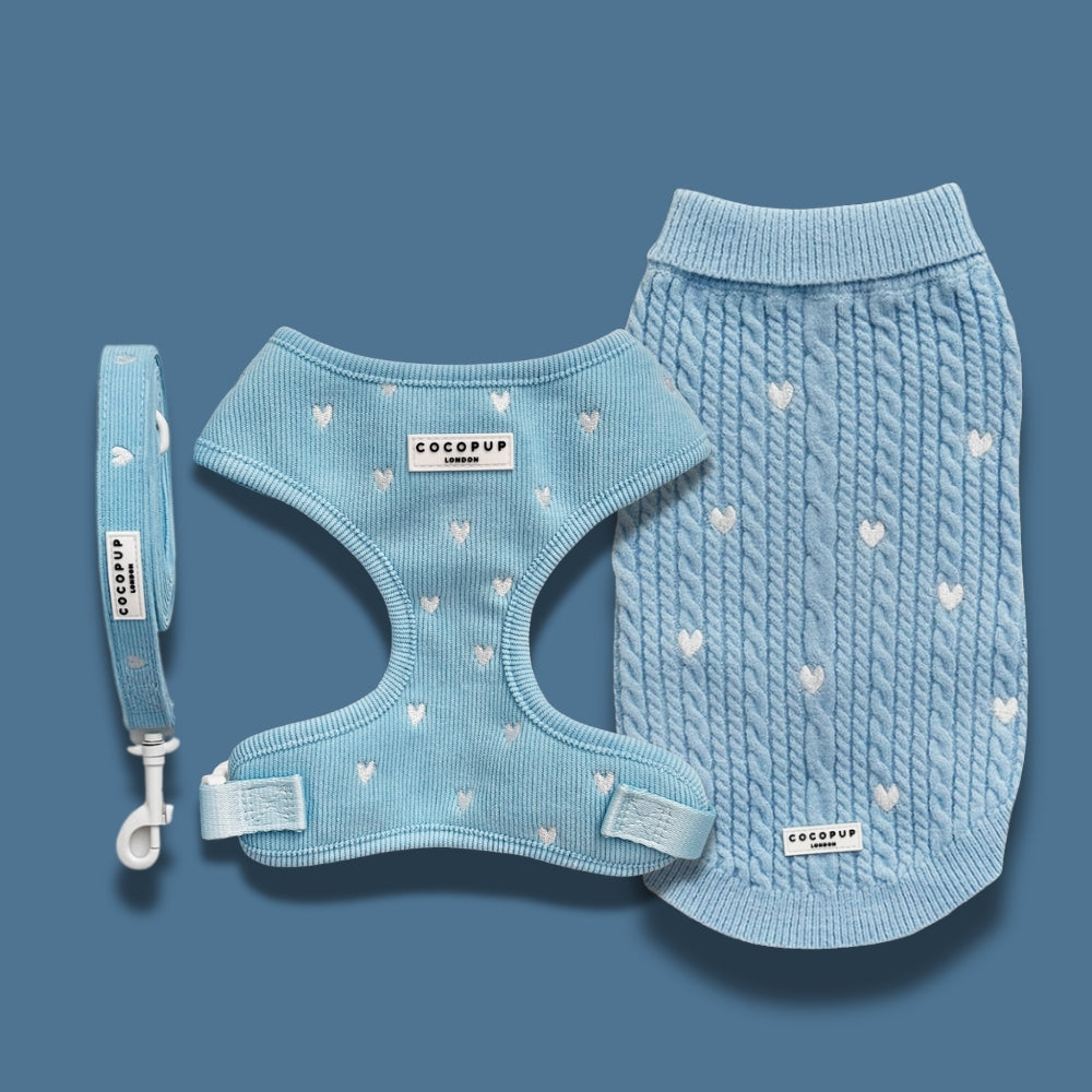 From crisp morning walks to cosy days at home, the Blue Heartstrings Bundle is designed to keep your pup warm, comfortable, and effortlessly stylish. This beautifully coordinated set includes a matching adjustable neck harness, lead, and cable knit jumper, making it the perfect all-in-one outfit for everyday adventures.