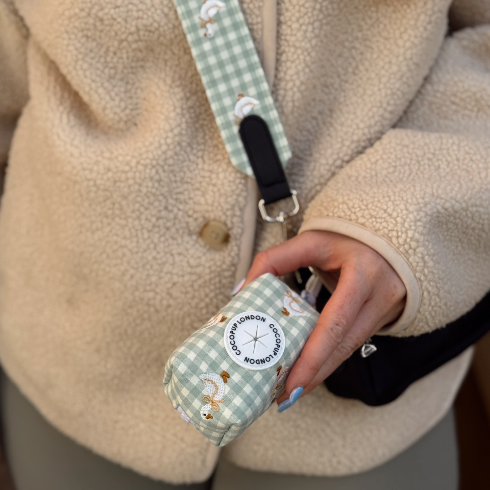 Say goodbye to fumbling for dog poo bags mid-walk. This charming poop bag holder leans into the trending sage green and white gingham check design and adds an extra level of silliness with adorned embroidered geese. Its countryside cottagecore aesthetic brings a smile to spring/summer strolls, whilst the practical design ensures you're always prepared.